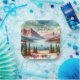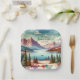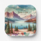 Assiettes en papier personnalisées avec une jolie vue montagneuse à l'aquarelle pour mariage. Les couleurs sont bleues, vertes et marron. Ajoutez les noms des mariés et la date du mariage dans la zone de personnalisation.