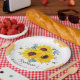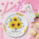 Ces assiettes de fête de mariage présentent un dessin floral aquarelle avec des tournesols, des feuilles d'eucalyptus, des abeilles et des alvéoles. Personnalisez le texte avec le nom de la mariée. Fournitures de fête de mariage assorties également disponibles.