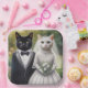 Deux chats sont habillés en tenue de mariage l'un en smoking et l'autre en robe de mariée tenant un bouquet