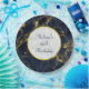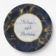 Plaques de papier personnalisées pour un anniversaire ou un autre événement. Conçu avec un arrière - plan élégant et élégant de marbre bleu marine et or. Couché sur le dessus est un cercle avec une fausse bordure en feuille d'or avec votre texte personnalisé à l'intérieur.
