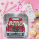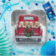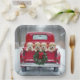 Des chiots récupérateurs d'or sont assis à l'arrière d'un camion rouge décoré d'une couronne de pin de Noël festive et de flocons de neige. Les flocons de neige peuvent être supprimés.