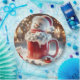Un joyeux bonhomme de neige de marshmallow est assis dans une tasse rouge remplie de cacao chaud, étalée autour de mini marshmallows et d'ornements de Noël