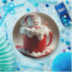 Un grand marshmallow conçu comme un bonhomme de neige avec un chapeau de Père Noël est assis sur une tasse rouge remplie de mousse crémeuse