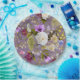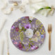 Médaille florale de vraies fleurs dans des teintes harmonieuses violettes, crème et rubis avec un arrière - plan mauve violet. Jolie addition ou cadeau de faveur pour les douches nuptiales, les mariages et les événements avec une palette violette tendance. Thèmes fleurs sauvages, Boho, Jardin.
