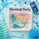Sur les assiettes de papier de la fête d'anniversaire de la fille à thème de sirène, on trouve une légende "Fête de sirène" et une sirène d'eau assise sur la plage entre deux étoiles de mer, tout en profitant d'un plateau de cupcakes et d'un coucher de soleil tropical. Parfait pour les fêtes "Under the Sea", nautiques et de plage. Art par KL Stock