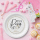 Moderne Or Noir Nom Il a mis une bague dessus Assiettes en papier. Le design comporte une bague de fiançailles. Idéal pour les enterrements de vie de jeune fille pour la future mariée.