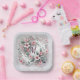 Une délicate couronne florale de fleurs roses et blanches est aménagée avec des feuilles verts et de minuscules baies, sur un fond dentelé. Le monogramme peut être modifié.