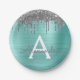 Assiettes de fête à monogramme et initiale en métal brossé pailleté métallisé argenté et sarcelle bleu aqua. C'est le cadeau parfait pour un 16e anniversaire, un mariage, une douche de mariée, un anniversaire de mariage, une baby shower ou une soirée de bachelorette pour quelqu'un qui aime le luxe glamour et les styles chics.