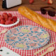 Cette assiette en papier mignonne et élégante présente un fond rose corail avec des motifs de pommes rouges, jaunes et roses, des fleurs de pommier blanches et des feuilles bleu marine. Personnalisez-la selon vos besoins. Vous pouvez trouver des produits assortis dans ma boutique.
