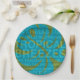 Mots qui signifient été : Brise tropicale, Bleu Cool et Lever de soleil Tequila combinés avec des images de Feuilles Monstera, Palmiers, Hibiscus et créer ce design graphique. Les serviettes en papier se coordonnent avec les plaques en papier dans les positions de couleur inversées.