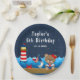 Cet ours mignon et amusant présente un ours marin sur un pont en bois avec une mouette et un crabe. Dans l'arrière - plan il y a un phare rouge et blanc, un oiseau mignon sur un voilier, des vagues de l'océan et un ciel étoilé bleu marine. Le texte combine des polices audacieuses et serif pour un look élégant et moderne. C'est parfait pour une fête d'anniversaire à thème nautique.