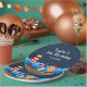 Cette assiette mignonne et amusante comprend un singe marin sur un pont en bois avec une mouette et un crabe. Dans l'arrière - plan il y a un phare rouge et blanc, un oiseau mignon sur un voilier, des vagues de l'océan et un ciel étoilé bleu marine. Le texte combine des polices audacieuses et serif pour un look élégant et moderne. C'est parfait pour une fête d'anniversaire à thème nautique.