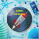 Navire spatial rouge et argent cool avec ses moteurs qui le projettent dans l'espace, passant par la Lune. Personnalisez avec votre texte, pour la plupart des célébrations. Idéal pour les enfants de tous âges.