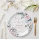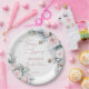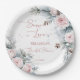 Modèle de plaques en papier personnalisées pour douche de mariée d'hiver neige en amour, roses blush rose poussiéreux à l'aquarelle sur branches de pins enneigés avec cônes de pin et flocons de neige, assiettes en papier monogrammes pour douche de mariée d'hiver, serviettes imprimées pour douche de mariée d'hiver, décor de table personnalisé pour douche de mariée