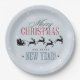 Plaques de Noël festives. Un arrière - plan gris subtil avec des flocons de neige. Lettres tendance qui dit : Joyeux Noël et Bonne Année. Avec une Père Noël silhouette noire dans son traîneau tiré par son renne volant à travers le ciel.