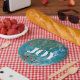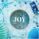 Cassant des vagues d'océan bleu profond dans l'arrière - plan avec des conifères et des baies de Noël encadrant le mot "JOY". Un magnifique design côtier sur le thème de Noël idéal pour Noël en été ou les fêtes de Noël côtières.