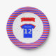 Plaques de fête prêtes à être personnalisées : il suffit de taper le nom du garçon ou de la fille dans la boîte. Le texte sur la bannière est également personnalisable, ou vous pouvez le laisser comme "ANNIVERSAIRE". Ce design est en rouge et bleu sur un arrière - plan blanc, et dispose d'un tee - shirt sportif intelligent avec le numéro 12, rayures et étoiles.