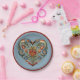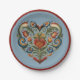 Cette plaque en papier présente une conception norvégienne Rosemaling Folk Art Heart sur un arrière - plan bleu coordonné avec une bordure rouge.