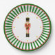Christmas Nutcracker paper plate in green, white and red tones with green and white stripes and golden stars