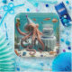 Un poulpe portant un casquette de fête tient une bière et s'assoit à côté d'un gâteau d'anniversaire sous l'eau.