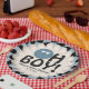 Featuring bold retro-inspired typography, a playful smiley face, and a modern dusty blue and cream color palette, these plates are perfect for a baby boy or gender-neutral baby shower.