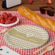 Personnalisez votre fiançailles de la Nouvelle-Orléans, mariage ou événement d'anniversaire avec ces plaques à papier comportant un symbole de Fleur de lis dans un or de champagne et une conception blanche de rayure de chevron.