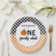 Orange One Éffrayant Dude Personnalisé Halloween 1er Anniversaire Plaques de papier de fête - Célébrez le grand de votre petit mec de façon éffrayante et amusante cette saison d'Halloween avec ce mignon tableau de contrôle orange et noir rétro visage souriant citrouille 1er Boo-Day Party thème pour les garçons. Avec damier noir et blanc et damier orange et blanc, couleurs classiques d'Halloween. Un citrouille souriant aux yeux éclair ajoute à l'esthétique amusante et rétro de saison éffrayante. Elevez votre décor de fête avec des plaques de papier d'anniversaire personnalisées! Tout le texte est modifiable.
