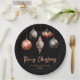 Cette assiette de vacances élégante et glamour présente des ornements en or rose et en bauble noir de Noël sur un arrière - plan noir. Le texte combine écriture manuscrite et polices sans serif modernes pour un look élégant et sophistiqué. Les étincelles et la parties scintillant apportent une touche festive et magique. C'est parfait pour les fêtes de Noël et les fêtes de fin d'année.