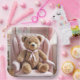 Un ours en peluche avec un ruban rose s'installe confortablement sur une chaise rembourrée rose dans une pièce à la lumière tamisée