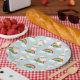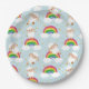 Prato de papel com ilustração de ovelhas no céu estrelado com arco-íris e nuvens.