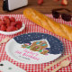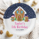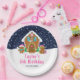 Cette assiette mignonne et festive présente une mignonne maison en pain d'épices décorée de bonbons roses et verts. A côté, d'adorables hommes en pain d'épice avec des cadeaux, habillés de chapeaux de Père Noël et d'une écharpe. Dans l'arrière - plan est un ciel bleu marine d'hiver avec élégantes flocons de neige en chute. Le texte combine les polices décoratives et sans serif pour un look élégant et moderne. C'est parfait pour une fête de Noël en pain d'épices.
