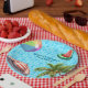 Organisez une soirée inoubliable dans la piscine avec cet azur - plan en tuiles bleu clair qui comprend un palmier, une balle de plage, un parasol et du melon frais.