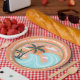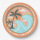 Plaques de papier simples à l'aspect de plage avec amusant rétro coloré Illustration de palmiers verts, vagues bleues, soleil orange, et rayons de soleil jaunes et roses. Entouré de mots liés à l'été... Vagues, Beach Parties, Good Vibes, Cocktails, Été, Amis, Rire, Soleil et Surf. Plats vraiment cool pour l'utilisation pendant la plage du barbecue des jardins et pour avoir en stock à votre patio ou bar tiki au bord de la piscine.