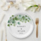 Cette assiette en papier pour mariage est illustrée avec une impression artistique de feuilles de vigne d'eucalyptus.