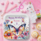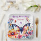 Un joli papillon entouré de fleurs roses et violettes aquarelle illustration fête d'anniversaire fille plaques personnalisées en papier.