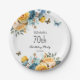 Plaques de papier de fête du 70e anniversaire avec de beaux roses jaunes et bleus poussiéreux et des papillons et fleurs crème. Ces assiettes peuvent être customisées pour n'importe quel âge. Contactez-moi pour obtenir de l'aide sur vos personnalisations ou pour demander des produits Zazzle correspondants ou coordonnés supplémentaires pour votre célébration.