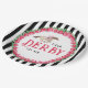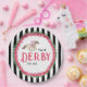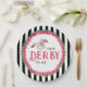 Cette assiette de fête Derby a un cheval de course aquarelle avec un jockey en rose entouré d'une couronne de roses rouges avec la phrase "Parlez DERBY à Moi". Il y a un fond rayé noir et blanc.