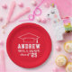 Les plaques de papier de graduation arrondies personnalisées présentent un design rouge et blanc (peut être modifié par "Customisez-le!") avec un capuchon de graduation et un texte personnalisé pour le nom et l'année de classe de la diplômée.