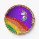Cette plaque de papier unicorne brillante et très colorée pour une fête d'anniversaire pour enfants, un baby shower ou pour tout ce que vous souhaitez comporte une petite licorne mignonne avec un arrière - plan violet vif derrière elle, avec un grand arc-en-ciel scintillant en dessous et un anneau brillant de parties scintillant en or autour du bord de l'assiette.