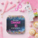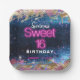 Design personnalisé moderne de plaque de papier Sweet 16 ans avec un arrière - plan de cireur bleu avec fausse feuille d'or, éclaboussures de peinture violet et rose et des lumières scintillantes et le texte "Sweet 16" écrit dans une typographie de néon rose chaud tendance.
