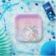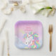 This magical paper plate features a pastel sky, soft clouds, and a rainbow-maned unicorn. Personalized for “Gianna’s 3rd Birthday,” it adds a whimsical fairytale touch to unicorn party tables.