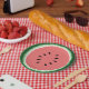 Cette plaque en papier amusante comporte une tranche de pastèque.