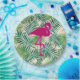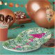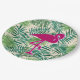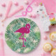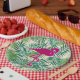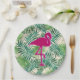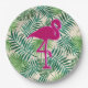 Plaques en papier avec motif feuille vert tropical et illustration flamand rose superposée qui ajoute une touche de fantaisie.