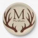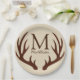 Neutre, rustique, et pays ecru arrière - plan avec des bois de cerf brun silhouette encadrant votre choix de lettre monogramme en brun et nom de famille complet en écriture brune. Ces assiettes sont parfaites pour les mariage ! Regardez les serviettes en papier correspondantes !