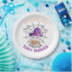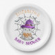 Ces charmantes assiettes en papier pour un baby shower sont ornées d'un joyeux petit fantôme portant un casquette sorcier violet, arborant avec plaisir le mot "BOO". L'arrière - plan est décoré d'une toile d'araignée complexe, avec des chauves-souris fantaisistes, créant une atmosphère délicieuse et festive parfaite pour célébrer l'occasion.