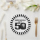 Plaque de papier 50e anniversaire noir et blanc avec rayures noir et blanc autour de la jante extérieure de l'assiette et votre propre photo dans le 0 de 50. Une excellente idée pour ajouter un peu de plaisir personnalisé à une fête spéciale du cinquantième anniversaire. Personnalisez avec votre propre photo dans le 0 sur 50 et nom. Lit Joyeux anniversaire 50. Graphiques par www.mylittleeden.com