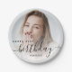 Plaques de papier de fête d'anniversaire modernes avec une photo personnalisée. Remplacez facilement l'exemple d'image par une photo de l'invité d'honneur. Le mot "anniversaire" apparaît dans un élégant script d'écriture manuscrite noire. Personnalisez le texte avec le nom et l'année d'anniversaire en noir sans serif police. Une superposition de dégradé blanc aide à faire apparaître le texte.