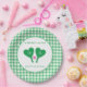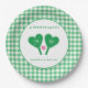 Ces assiettes en papier sont parfaites pour les soirées bachelorette, les douches en couple, les mariages et plus avec un thème de pickleball. Ces assiettes sont illustrées de pagaies en forme de coeur et d'un pickleball et sont prêtes à être customisées avec votre propre titre, des initiales sur les pagaies et des noms complets en-dessous de tous avec un modèle de couleur vert et rose preppy et un arrière - plan en vichy vert et blanc.