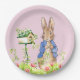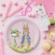 Pierre le lapin dans son jardin en train de vérifier sa maison d'oiseaux.