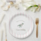 Celebrate your little girl’s birthday with these adorable pink t rex tutu plates featuring a watercolor dinosaur with a bow and party hat. Perfect for a sweet Stomp Chomp and Roar birthday theme.